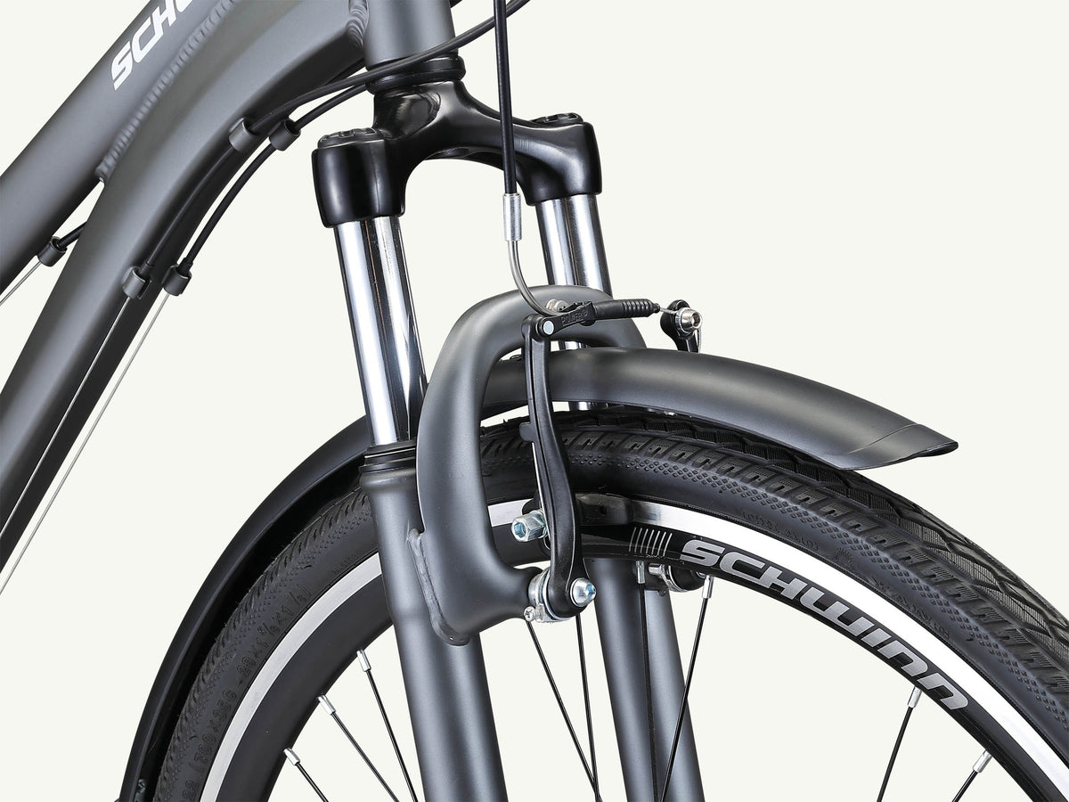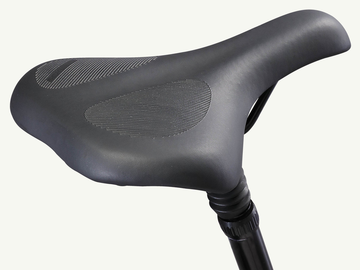 Suspension seat post, Schwinn hybrid seat, and ergonomic grips provide extra comfort and an upright riding position.