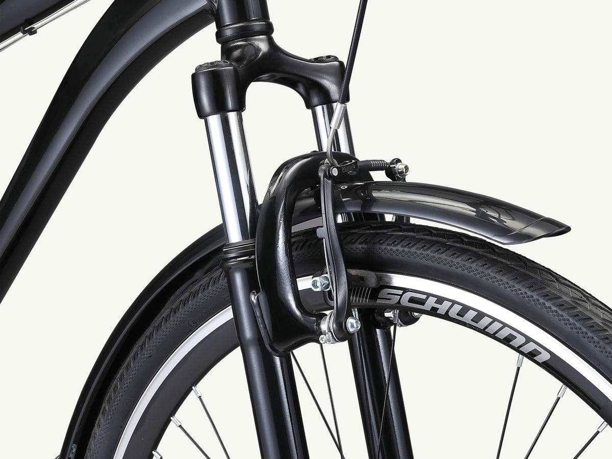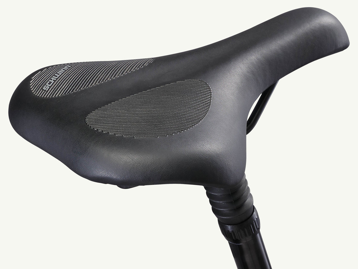 Suspension seat post, Schwinn hybrid seat, and ergonomic grips provide extra comfort and an upright riding position.