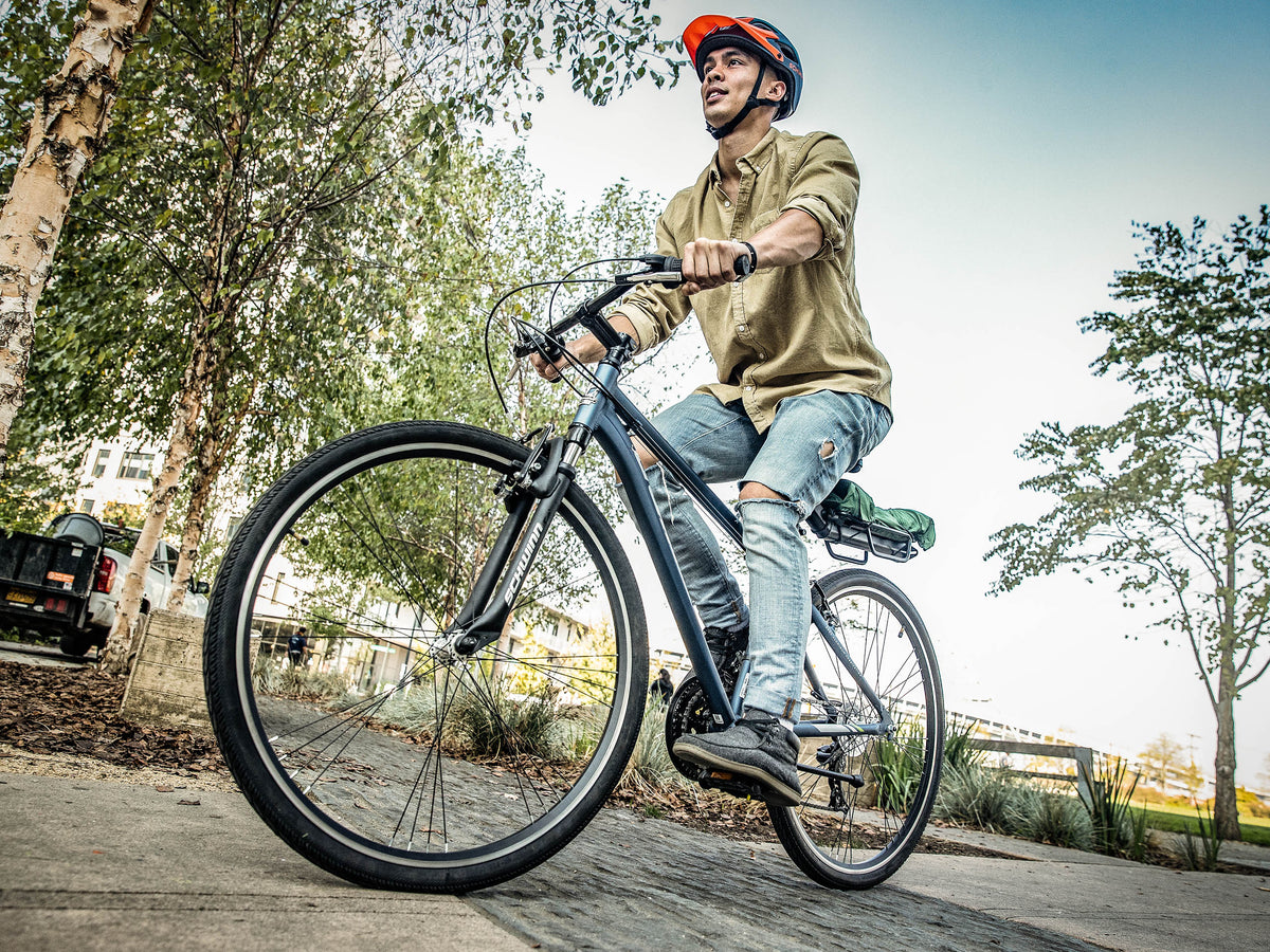 Schwinn alloy hybrid frame with Schwinn fit geometry and suspension fork provide a smooth ride. Great for around town, through the park, or on light trails.