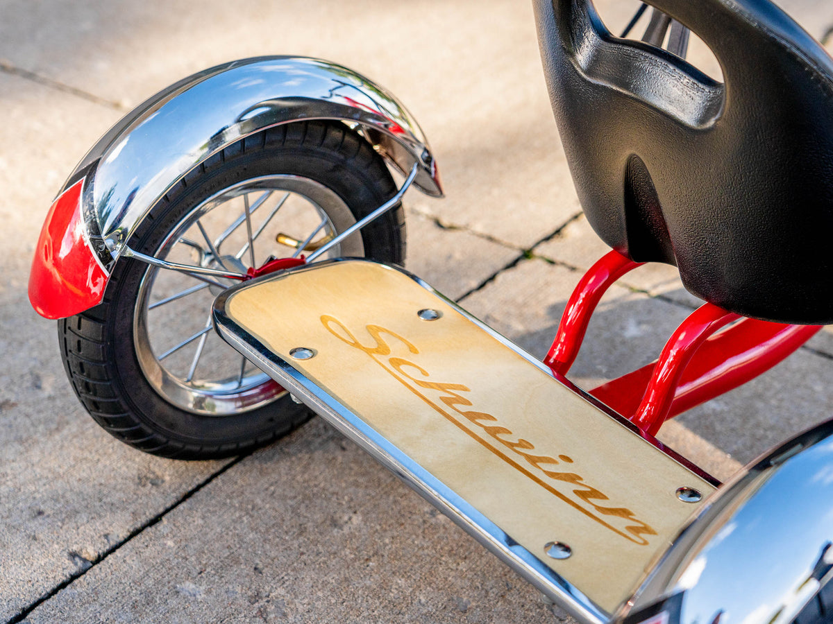 The classic rear deck is made of genuine wood with burned-in Schwinn logo, while the scalloped chrome fenders add to the Roadster's timeless vintage looks.
