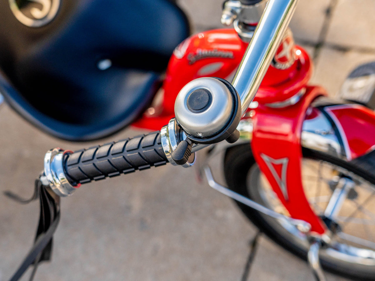 Take to the streets in style with mustache-style cruiser bars and a classic bike bell. Flowing fabric tassels make this a great gift for kids who love classic biker style.